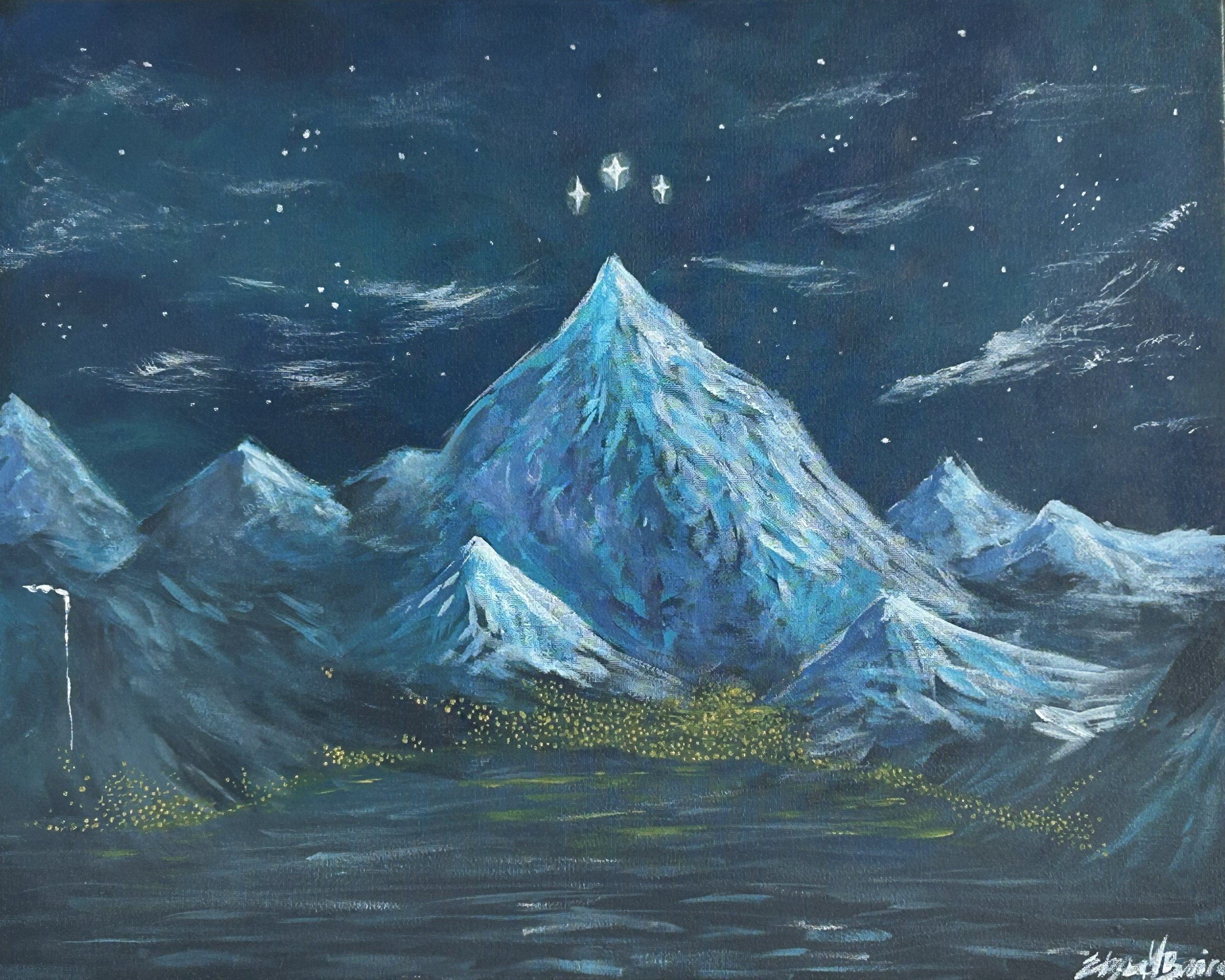 This painting is done completely in acrylics. Acrylics are a thick, liquid paint that dries hard. Acrylics dry super fast and can be good for harsher lines and bolder paintings.